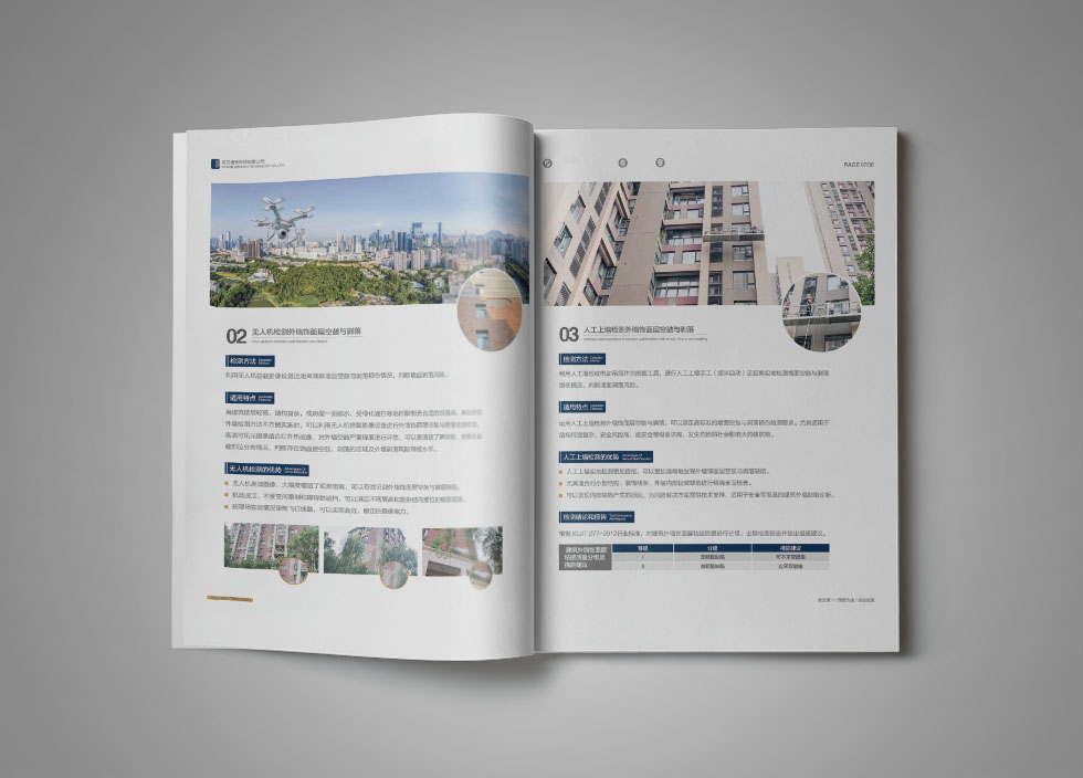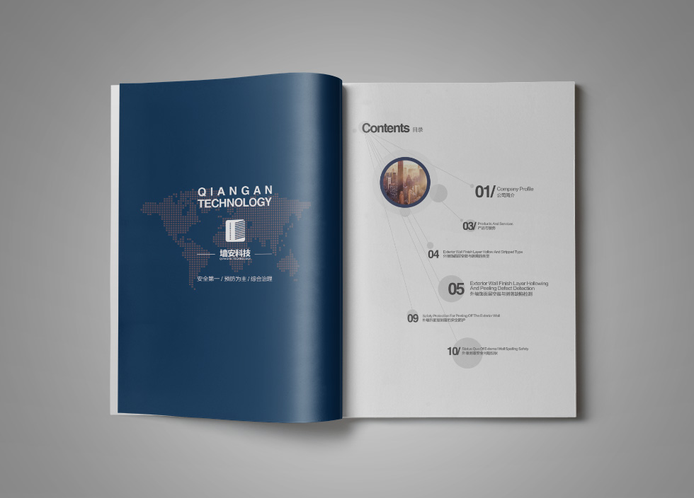 項(xiàng)目背景:武漢墻安科技有限公司是一家專業(yè)的房屋安全治理與維保服務(wù)商,以房屋外墻安全檢測(cè)與風(fēng)險(xiǎn)預(yù)控為核心業(yè)務(wù),提供專業(yè)的外墻空鼓、剝離、脫落檢測(cè),以及風(fēng)險(xiǎn)評(píng)估、風(fēng)險(xiǎn)控制、方案設(shè)計(jì)等服務(wù),為各類住宅、辦公寫(xiě)字樓、工業(yè)廠房等房屋提供全壽命周期內(nèi)的持續(xù)性、全方位安全保障。艾的爾承接其畫(huà)冊(cè)設(shè)計(jì)制作,成立品牌設(shè)計(jì)小組,與企業(yè)進(jìn)行深入溝通,明確企業(yè)對(duì)于畫(huà)冊(cè)設(shè)計(jì)的需求,通過(guò)對(duì)企業(yè)行業(yè)屬性和主要服務(wù)的深入了解和研究,在畫(huà)冊(cè)設(shè)計(jì)、創(chuàng)意的過(guò)程中,封面大膽留白,將重點(diǎn)突出“房屋外墻剝落安全治理專家”。