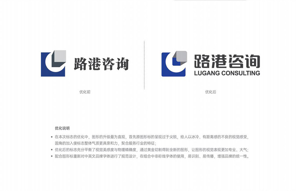 項(xiàng)目背景:湖北路港工程咨詢有限公司成立于2001年,是湖北省建設(shè)工程造價咨詢協(xié)會第四屆理事會副理事長單位,公司具有中華人民共和國住房和城鄉(xiāng)建設(shè)部頒發(fā)的工程造價咨詢甲級資質(zhì)等多項(xiàng)資質(zhì)。艾的爾設(shè)計承接其品牌VI設(shè)計,與客戶深入溝通后,明確企業(yè)寓意對LOGO設(shè)計進(jìn)行優(yōu)化,在此標(biāo)志優(yōu)化中圖形的升級最為直觀,原圖形標(biāo)的呈現(xiàn)過于尖銳,給人冰冷的視覺感受,優(yōu)化后的標(biāo)志整體氣質(zhì)具有親和力,契合服務(wù)行業(yè)的特征,也通過黃金切割得到全新的圖形,視覺表現(xiàn)更加專業(yè)、大氣。